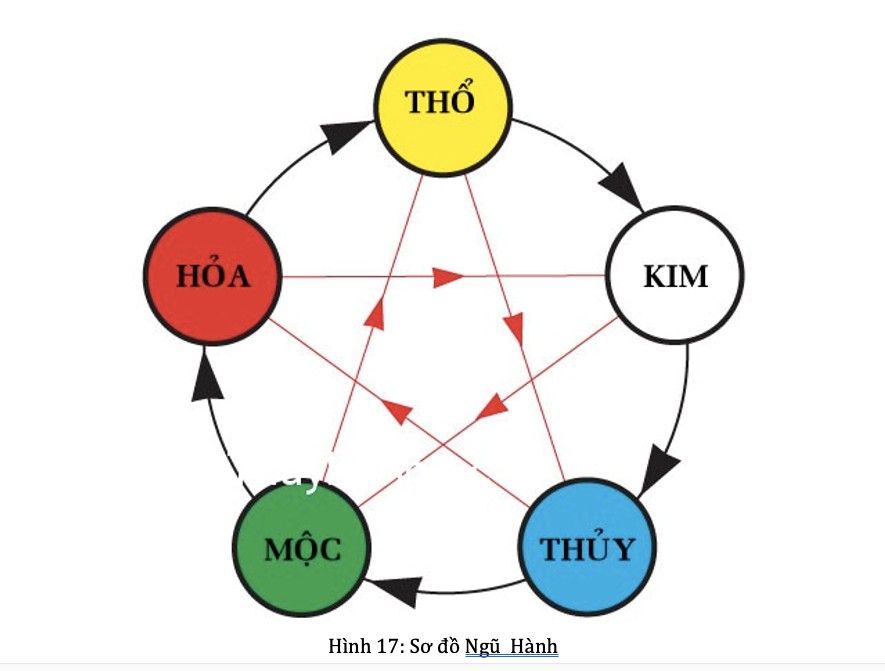 Giữa ngũ hành có 2 kiểu quan hệ 1- Tương sinh và 2- Tương khắc . Trên biểu đồ mũi tên màu đỏ là quan hệ tương khăc, ví dụ Thuỷ - Hoả , Hoả- Kim, Kim- Mộc v.v.. là tương khắc. Còn mũi tên màu đen là Tương Sinh, ví dụ như Thuỷ- Mộc, Mộc-Hoả , Hoả -Thổ v.v..